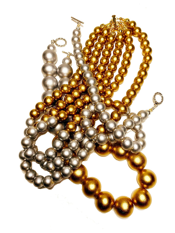 A mix of sophisticated shades, this eclectic necklace features 3 graduated strands of vibrant hand painted wood round beads in Semi Matte Gold and Silver. Strung on super strong Silk threads and finished with a simple Gold Plated slide clasp, this super lightweight necklace measures approximately 18-21 inches in length. Chic!