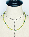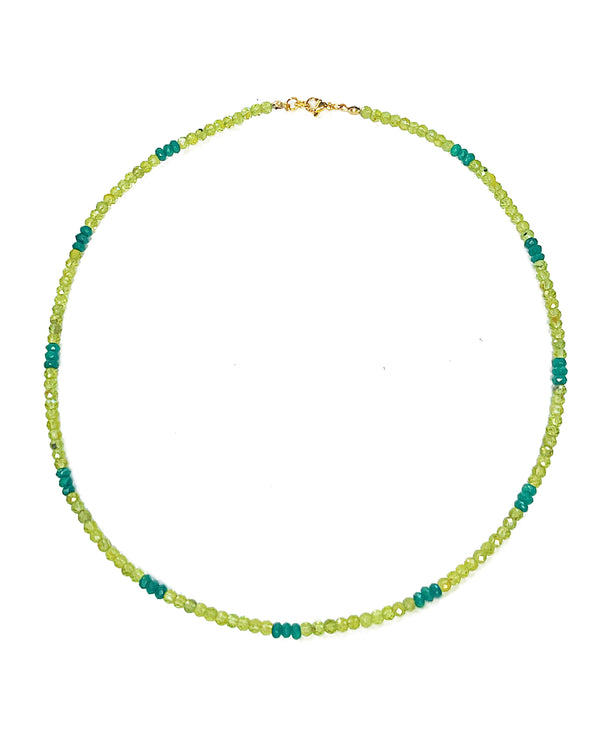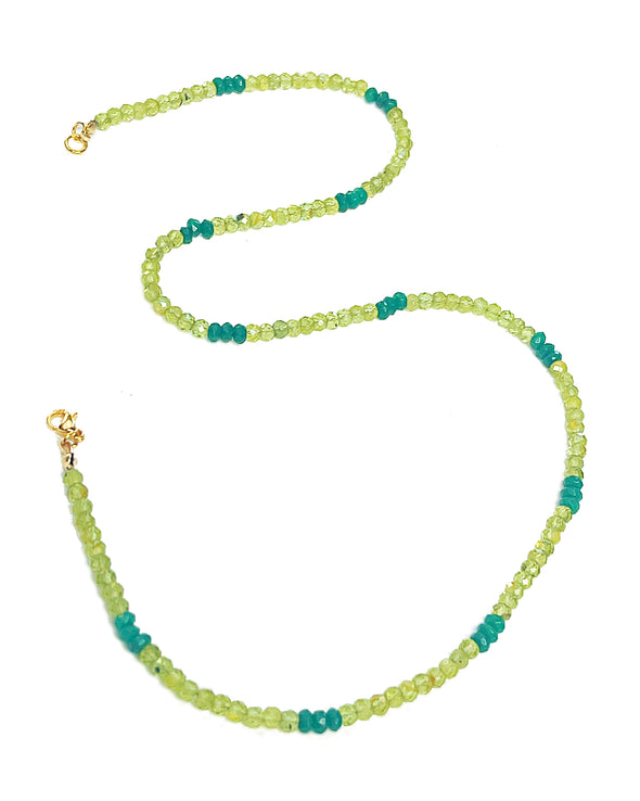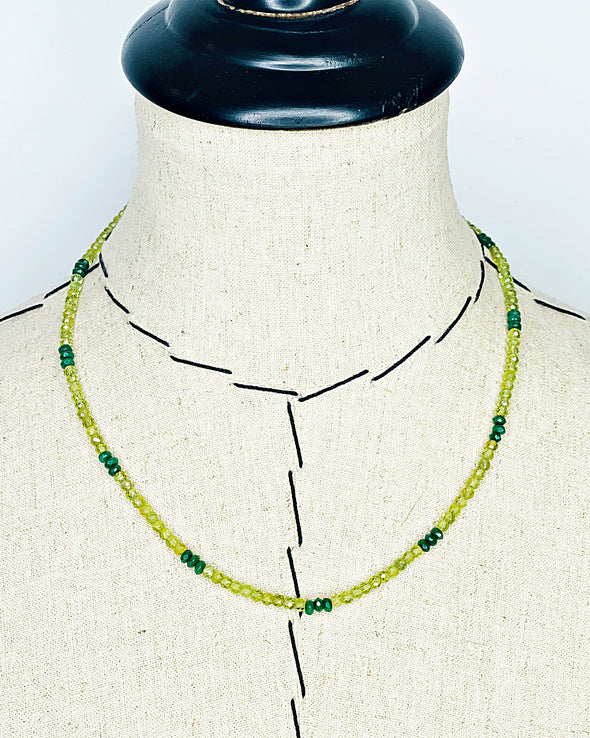 In a brilliant color combination, this necklace is small but makes a lovely statement. A single strand of Peridot and Emerald faceted rondelle beads are finished with a tiny gold plated clasp. Pair with a bold pendant necklace.